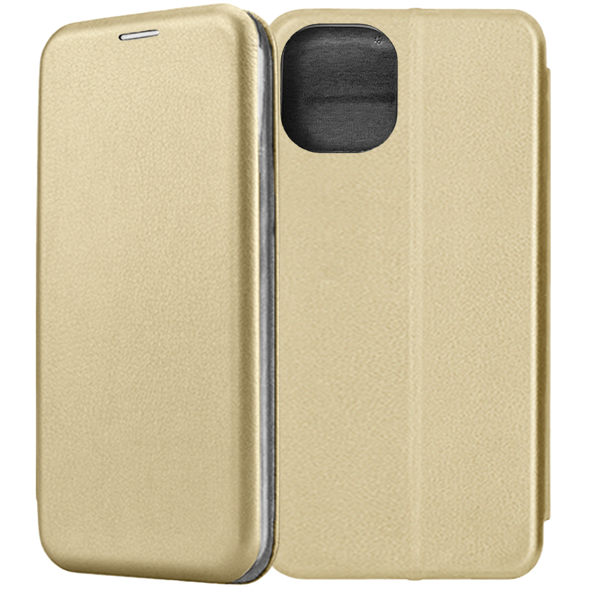 Чехол-книжка Fashion Case золотистого цвета для смартфона Apple iPhone 12 mini с твердой магнитной 3D обложкой и силиконовой прозрачной вставкой внутри легко трансформируется в удобную подставку, имеет отделение для карт.
