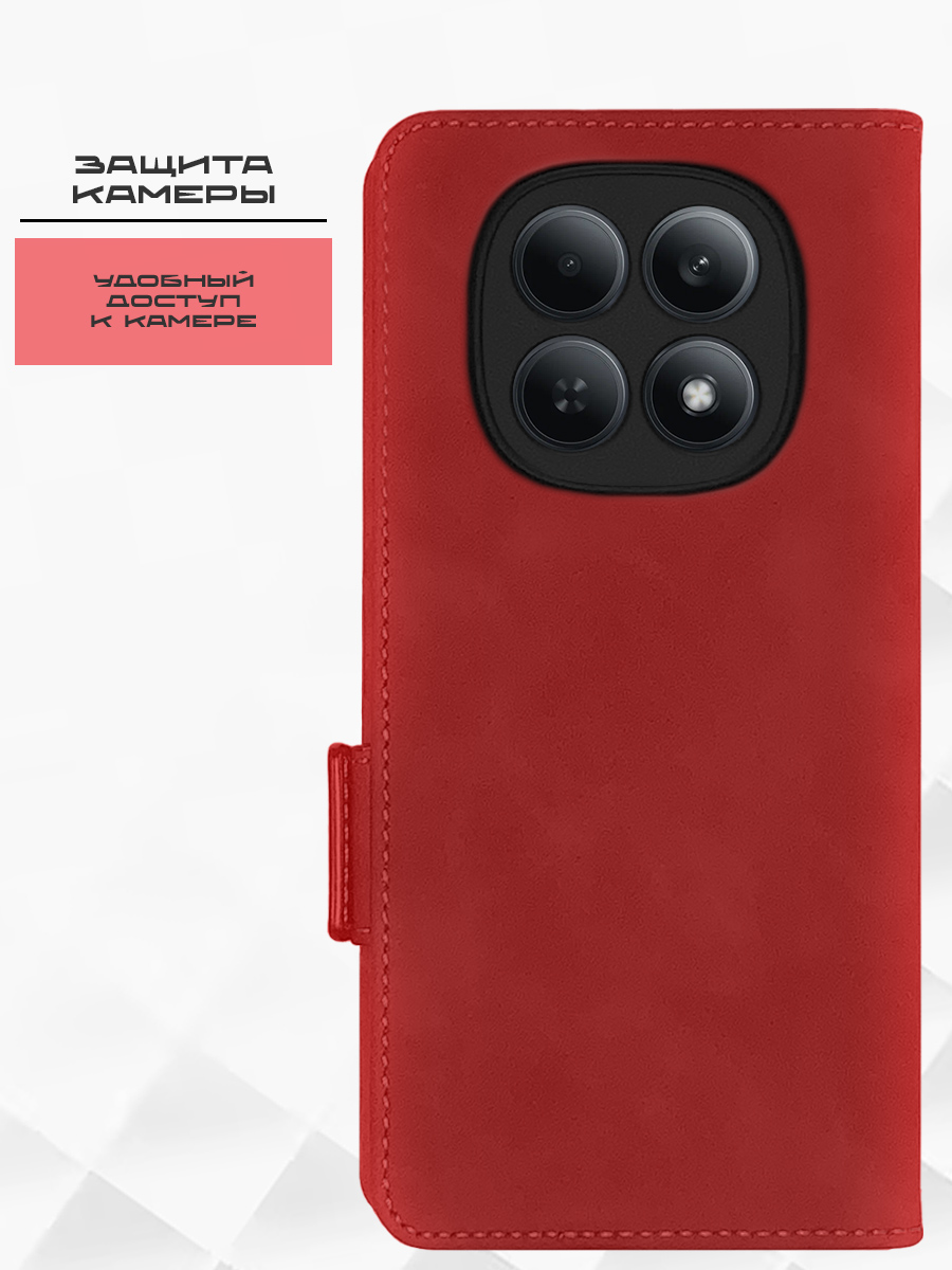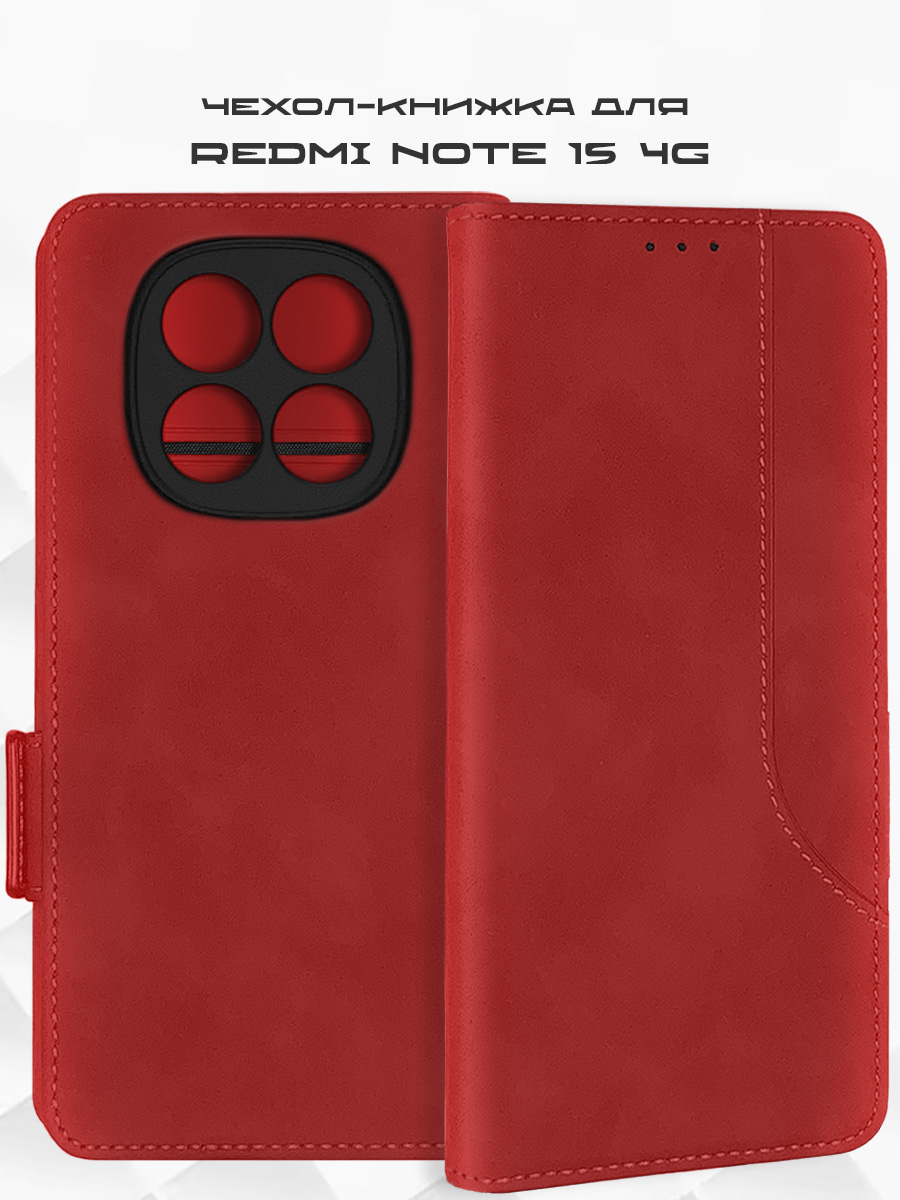 Чехол-книжка MSCase красного цвета для смартфона Xiaomi Redmi Note 15 с твердой магнитной обложкой и силиконовой вставкой внутри легко трансформируется в удобную подставку, имеет отделение для карт.