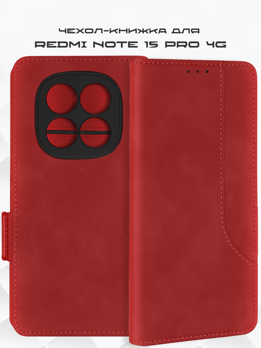 Чехол-книжка MSCase красного цвета для смартфона Xiaomi Redmi Note 15 Pro 4G с твердой магнитной обложкой и силиконовой вставкой внутри легко трансформируется в удобную подставку, имеет отделение для карт.