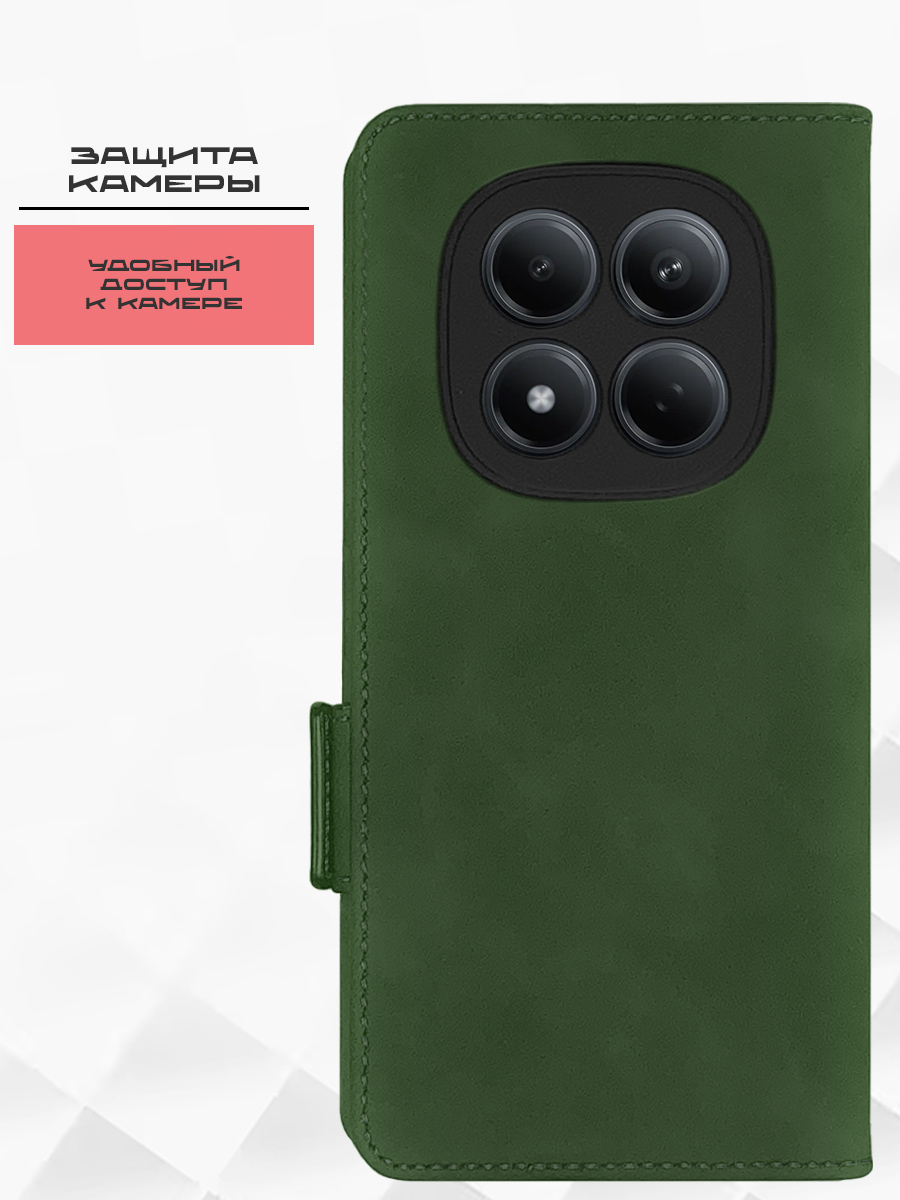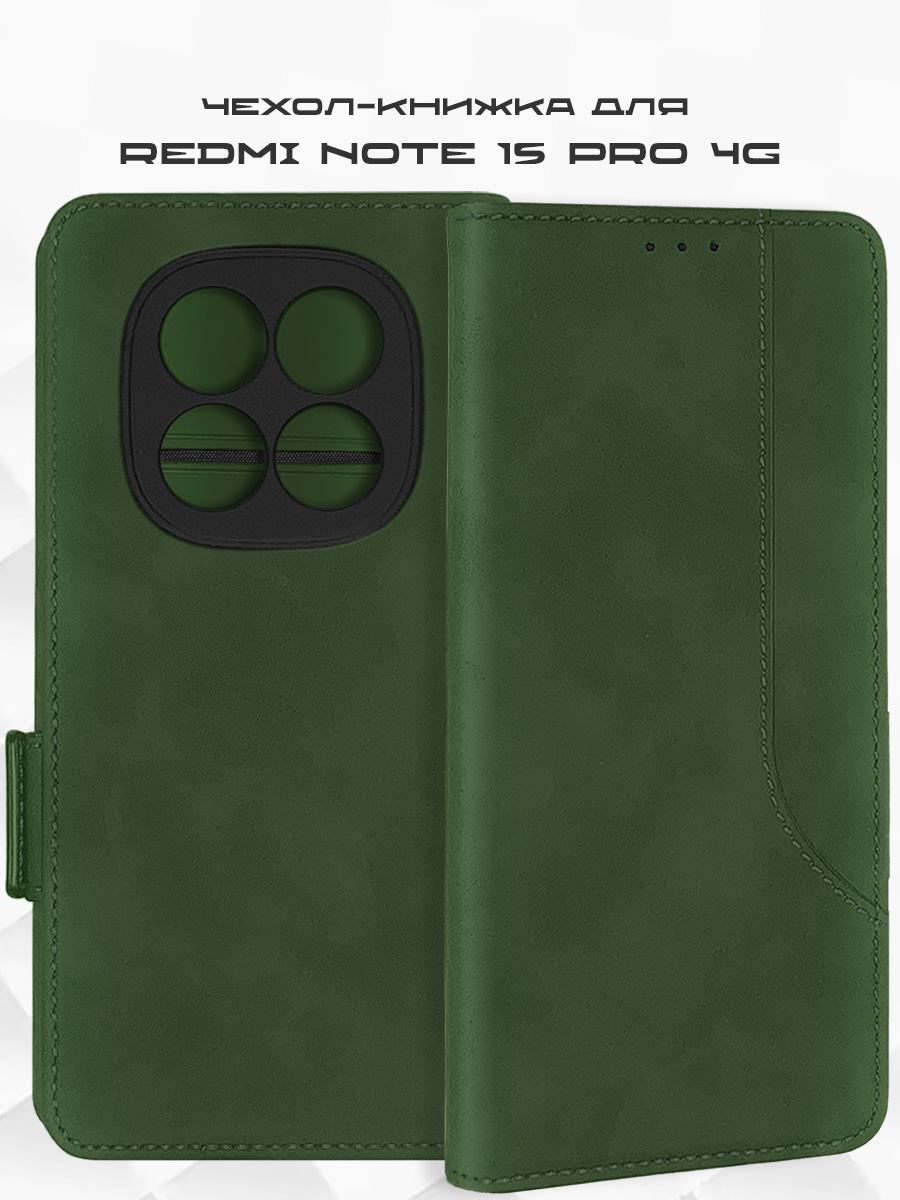 Чехол-книжка MSCase зеленого цвета для смартфона Xiaomi Redmi Note 15 Pro 4G с твердой магнитной обложкой и силиконовой вставкой внутри легко трансформируется в удобную подставку, имеет отделение для карт.