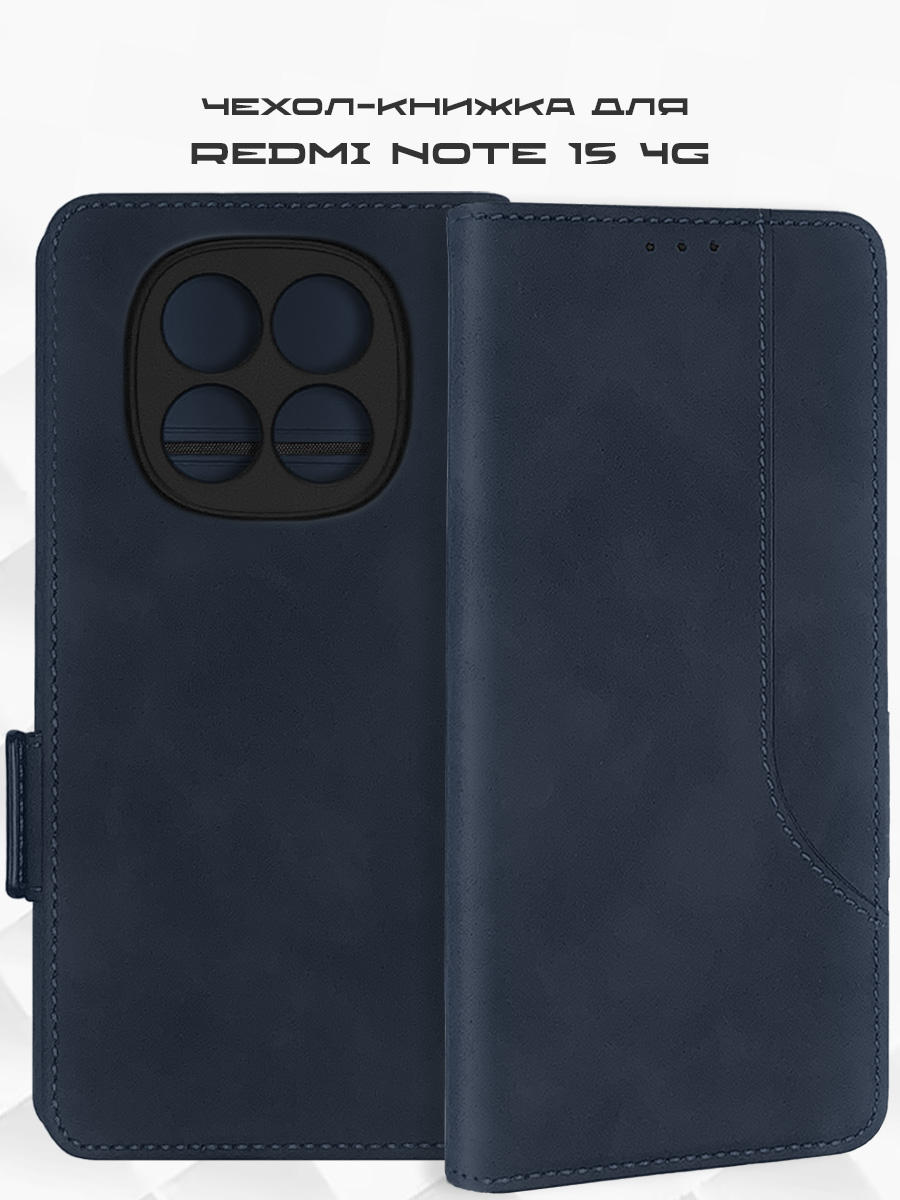 Чехол-книжка MSCase темно-синего цвета для смартфона Xiaomi Redmi Note 15 с твердой магнитной обложкой и силиконовой вставкой внутри легко трансформируется в удобную подставку, имеет отделение для карт.