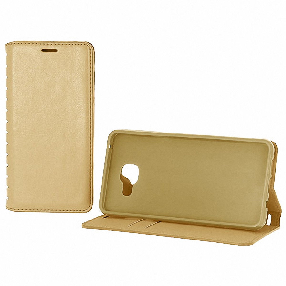 Золотистый чехол-книжка Book Case для Samsung Galaxy A3 (2016) A310 с магнитной обложкой и перфорацией в месте сгиба. Мягкая силиконовая TPU вставка в цвет кейса для надежной фиксации смартфона. Складывается в подставку для комфортного просмотра видео.