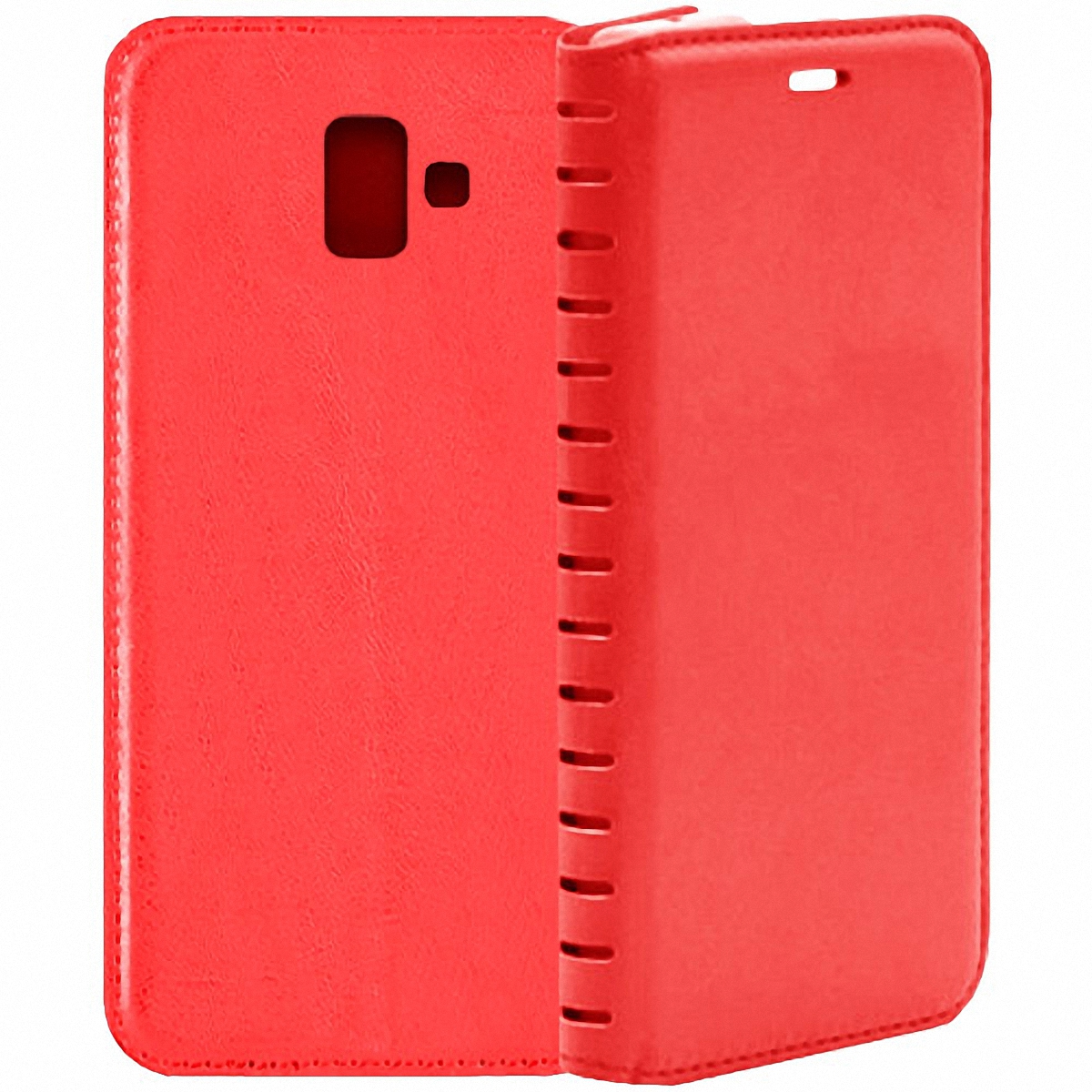 Красный чехол-книжка Book Case для Samsung Galaxy J6+ J610 с магнитной обложкой и перфорацией в месте сгиба. Мягкая силиконовая TPU вставка в цвет кейса для надежной фиксации смартфона. Складывается в подставку для комфортного просмотра видео.